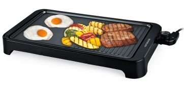 Elektrický gril Orava Grillchef-5 je skvělým pomocníkem na grilovačku pro ty, kteří nechtějí dlouho čekat na grilované dobroty a rádi si užívají na grilování pohodu. Na rozdíl od jiných typů grilů, z elektrického grilu se zbytečně nekouří, jelikož na něj nepotřebujete žádné extra palivo. Stačí gril zapojit do elektrické sítě, nastavit požadovanou teplotu grilování a naložit na gril vše, co vám z grilu chutná. Dostatek masa, klobásek, sýra, ale také cuketa, lilek či jiná zelenina se vejdou na velkorysou grilovací plochu o rozměrech až 50 x 27 cm, aby vaši hosté nemuseli dlouho čekat na svou porci grilovaných delikates. Grilovací plocha je rozdělena na dvě části - hladkou a vroubkovanou -, což vám umožní najednou připravovat například grilované ryby, ale také vajíčka do hamburgerů na hladké ploše a poctivé kusy steaků na vroubkované části. Vhodná teplota pro grilování se snadno nastavuje otočným knoflíkem až do teploty 220 °C pro okamžité rozpálení grilu. V závislosti na nastavené teplotě se grilované delikatesy mohou připravovat pomalu a důkladně na mírné teplotě, dají se rychle upéct tak, aby zůstaly šťavnaté, a při nastavení teploty do 60 °C můžete nechat ugrilované kousky na grilu ohřívat se, aby nevychladly, dokud si z nich hosté zase naberou.