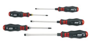 Pro automobilový a kovozpracující průmysl. Obsah dodávky: plochý šroubovák (1 x 5.5 mm, délka břitu 100 mm), plochý šroubovák (1.2 x 7 mm, délka břitu 125 mm), plochý šroubovák (1.6 mm x 9 mm, délka břitu 150 mm), šroubovák PH1 (délka břitu 80 mm), šroubovák PH2 (délka břitu 100 mm).